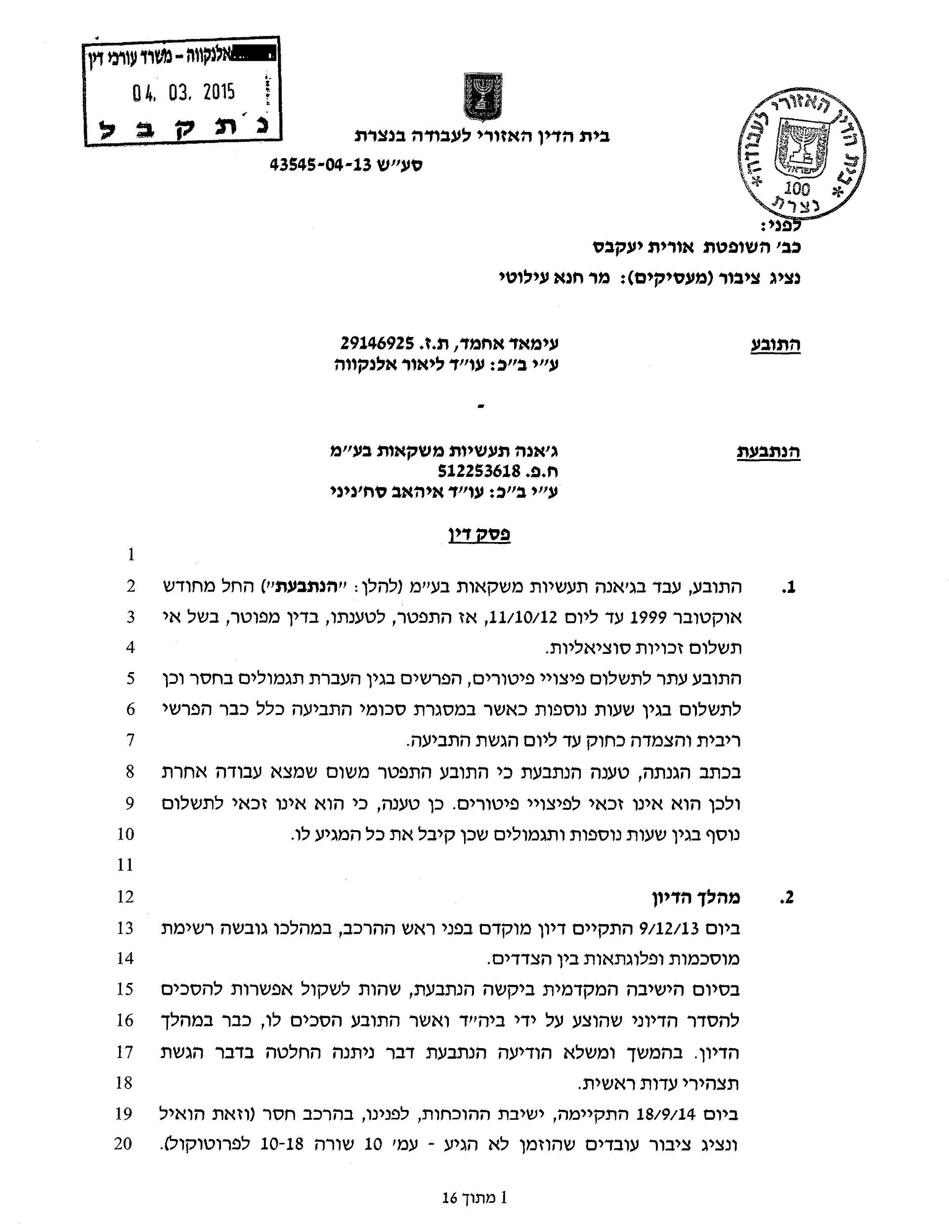 סע"ש 43545-04-13 עמאד אחמד נ' ג'אנה תעשיות בע"מ