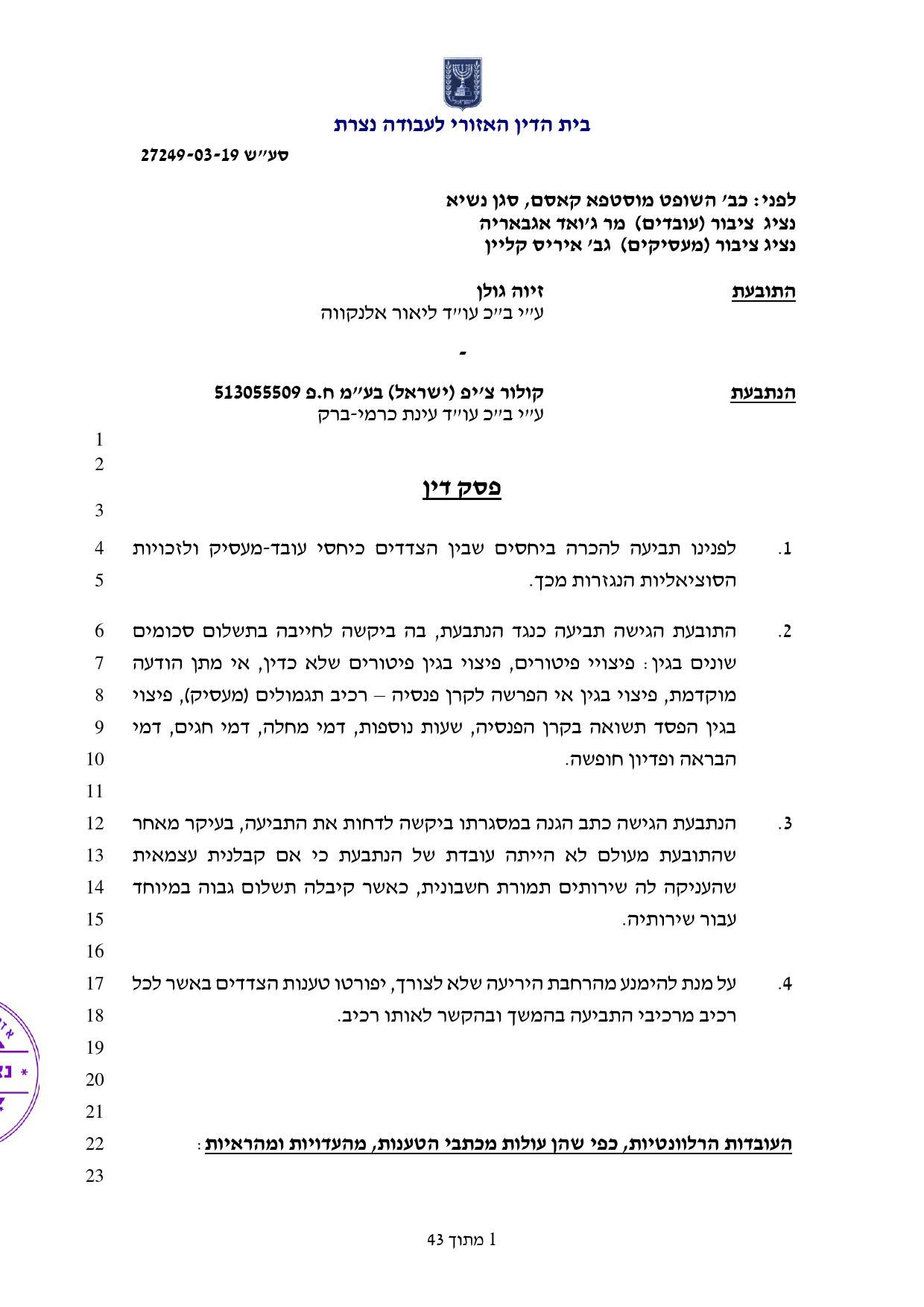 סע"ש 27249-03-19 זיוה גולן נ' קולורצ'יפ בע"מ