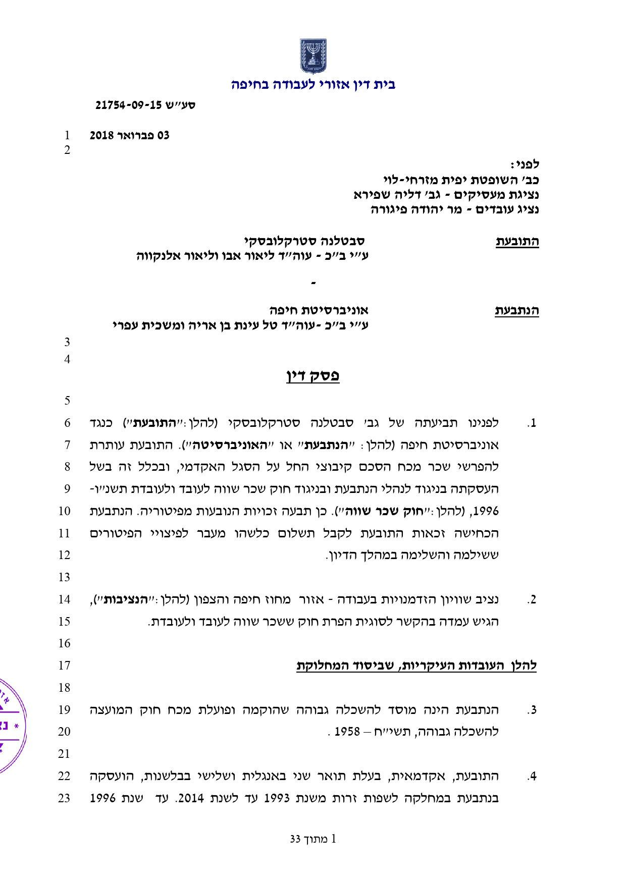 סע"ש 21754-09-15 סבטלנה סטרקלובסקי - אוניברסיטת חיפה